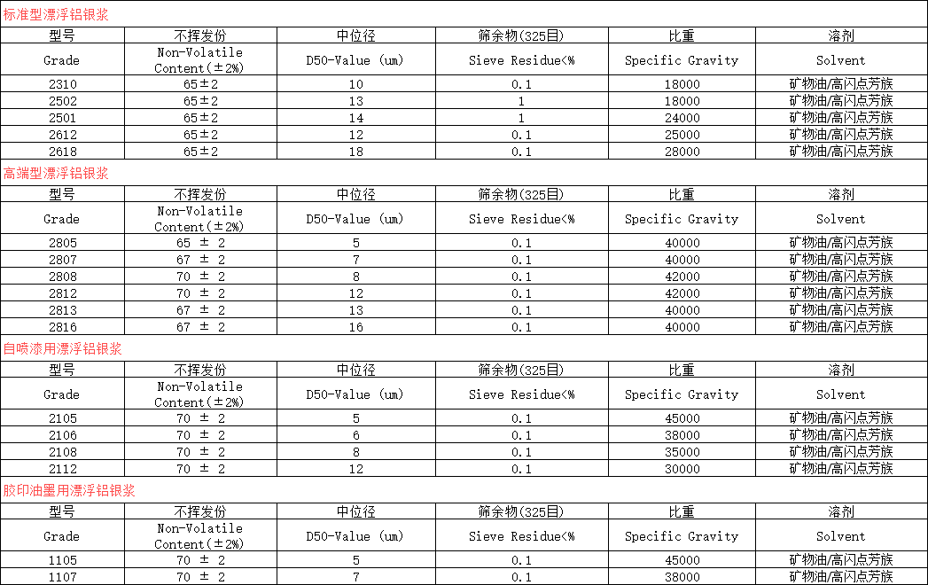 漂浮型鋁銀漿具有非常好的漂浮力,可以漂浮于漆膜表面,能夠有效地反射光和熱;此外,還具有遮蓋力和亮白度,在低酸值樹脂體系中能產(chǎn)生鏡面效果。