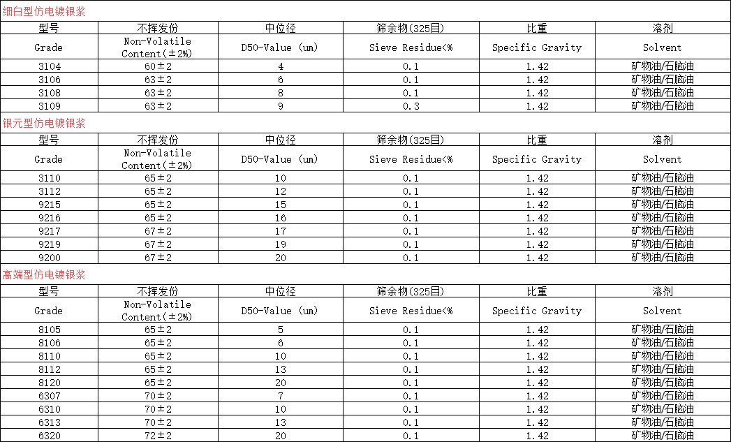 仿電鍍鋁銀漿是集細(xì)白銀和閃光銀的優(yōu)點(diǎn)于一體,既有細(xì)白銀的遮蓋力和白度,又有閃銀的亮度和閃爍效果,的仿電鍍銀會(huì)有鏡面和鍍銘的效果。根據(jù)不同的效果可分為銀元型、細(xì)白型和絲光型三類(lèi)。